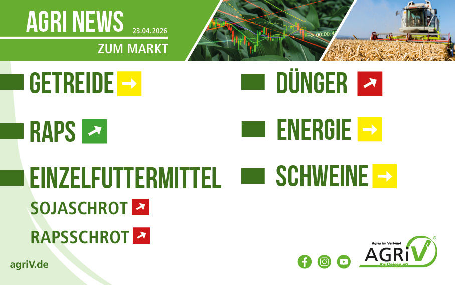Fundamentale Daten über die weltweite Rapsversorgung treten weiterhin in den Hintergrund. Der Rapsmarkt bleibt weiterhin volatil und er hängt vollständig an der Nachrichtenlage. Raps ex Ernte frei Spyck Kleve 2026 liegt bei ca. 490,00 €.Das Niveau bleibt zur Absicherung interessant. Die Schwankungen liegen bei bis zu 10,00 € pro to und Tag. Die Wertigkeit des Rapses liegt deutlich über dem doppelten Weizenpreis. Auch aus diesem Blickwinkel ist der Rapspreis getrieben durch den Rohölpreis sehr gut bewertet.